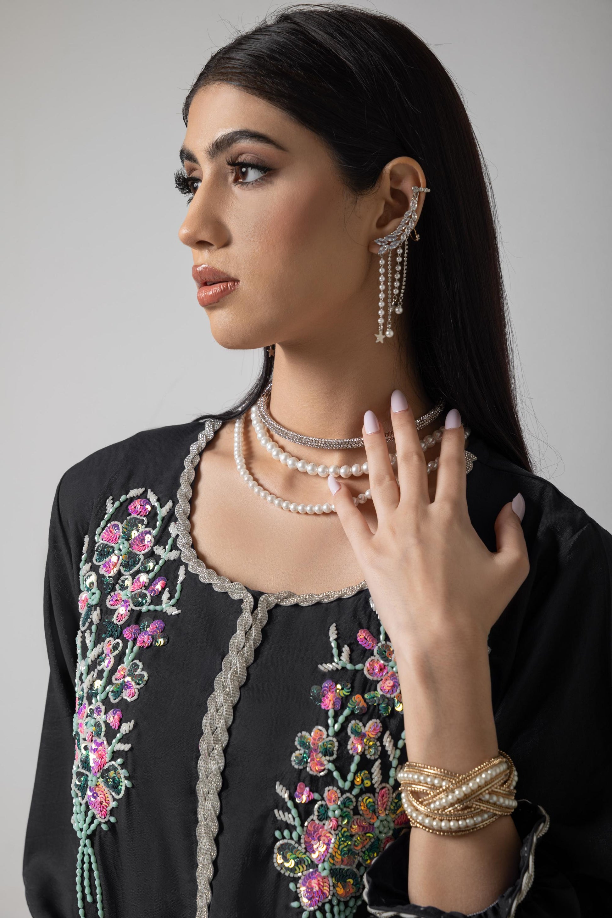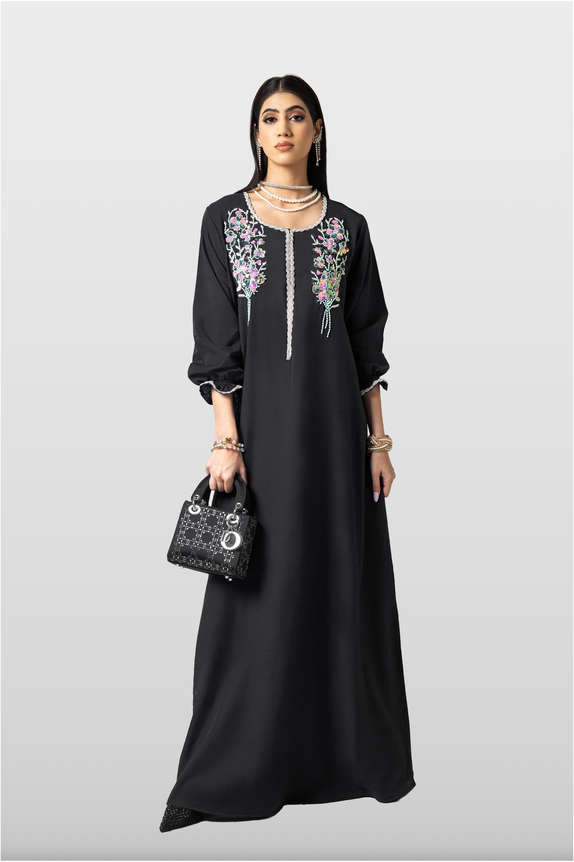 An elegant black jalabiya in premium silk. Featuring intricate handworked floral motifs with