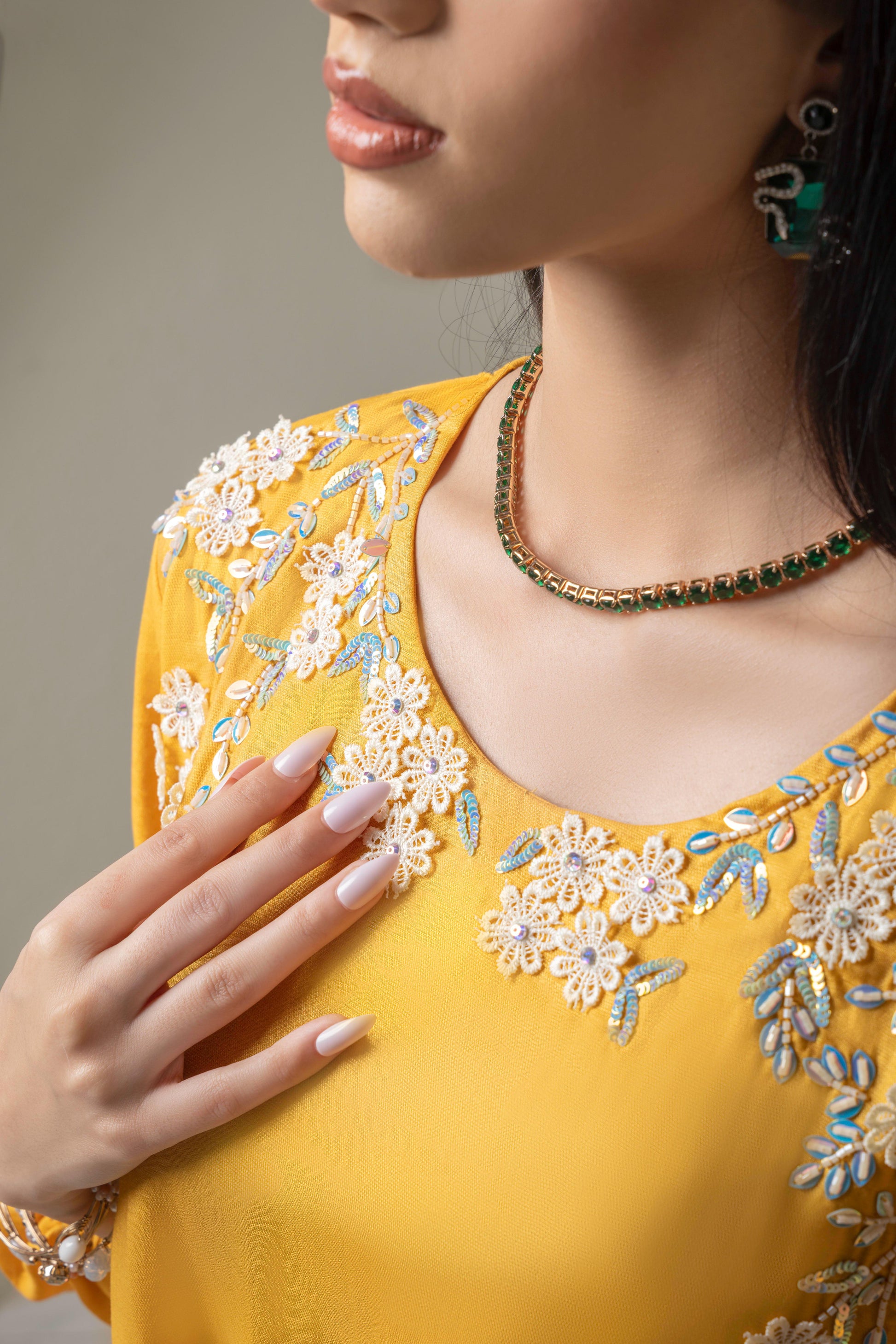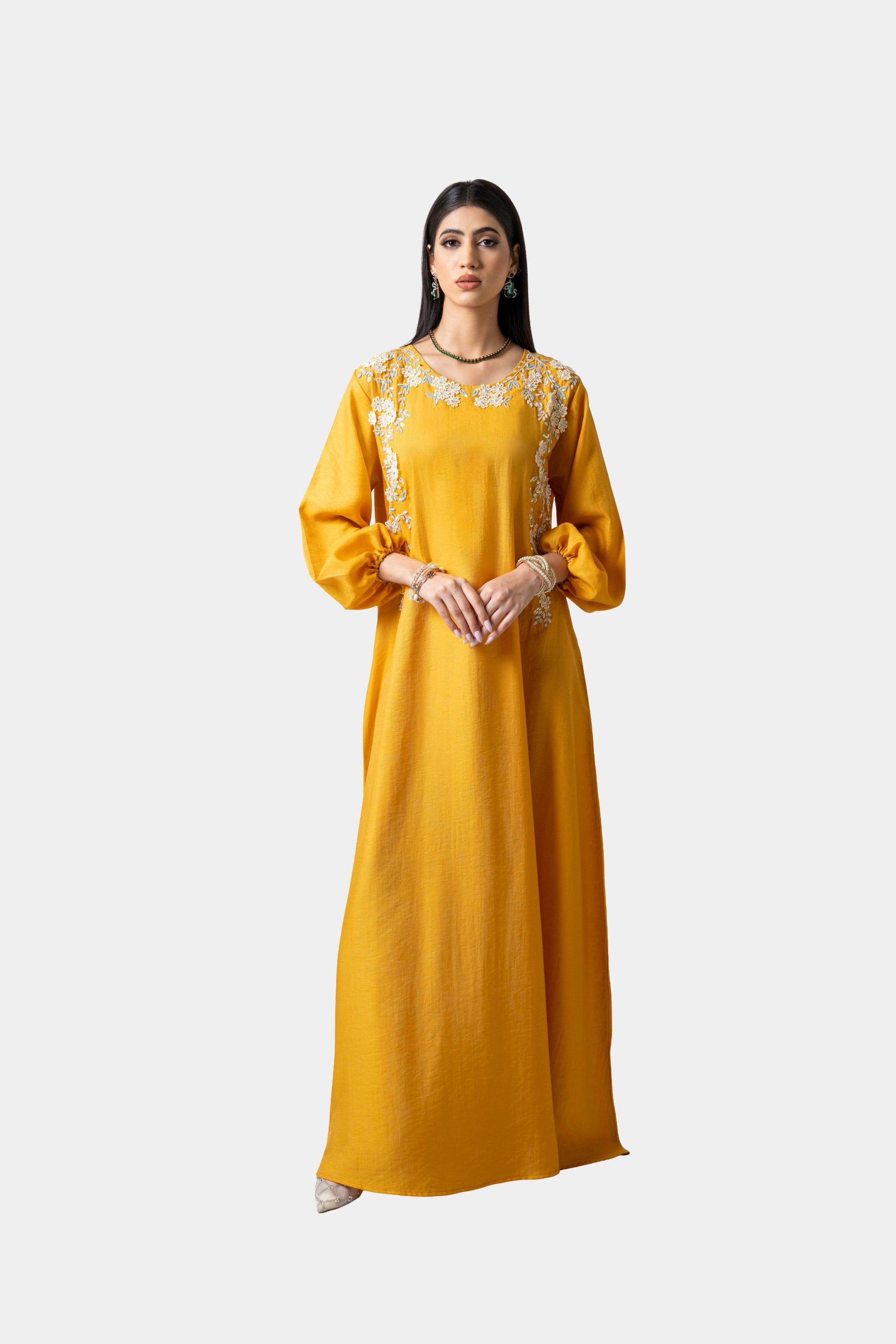 A dreamy jalabiya in soft yellow ochre, crafted from fine shimmer silk. Adorned with